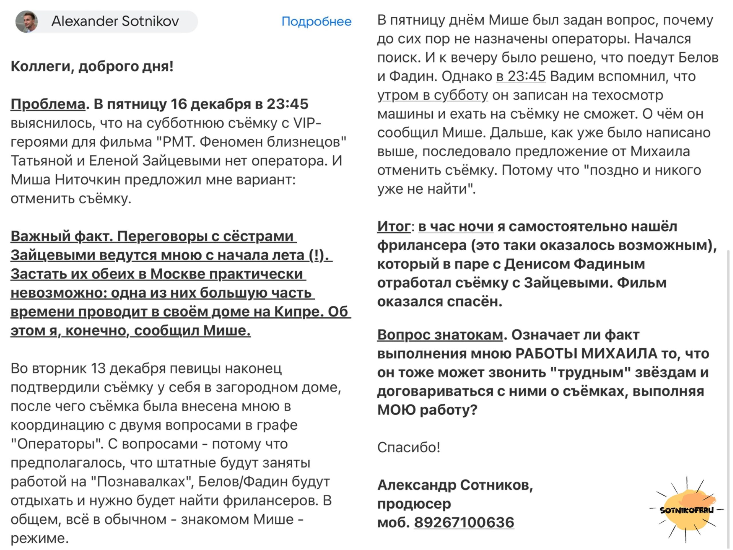 9 лет назад в этот день кое-как договорился с сёстрами Зайцевыми на интервью (то одна, то другая — на Кипре), как мне звонит «близняшка» Татьяна: «Александр… У нас ведь день рождения 16-го декабря… Давайте 17-го». Я, естественно, — ok. И тут вмешивается технический диретор из нашего продакша Миша Ниточкин, который координирует операторов. Их, говорит, нет (см. скрин). Пришлось разруливать самому. Оператора нашёл.